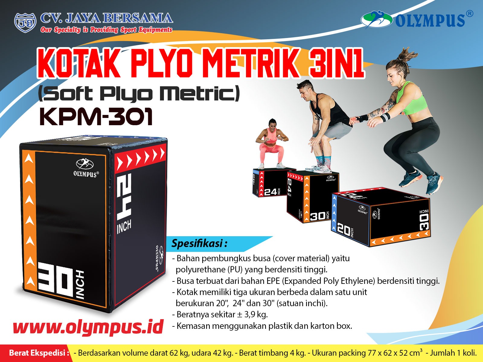 Spesifikasi Kotak Plyo Metrik 3in1 KPM-301 (Soft Plyo Metric) merek Olympus sebagai berikut :